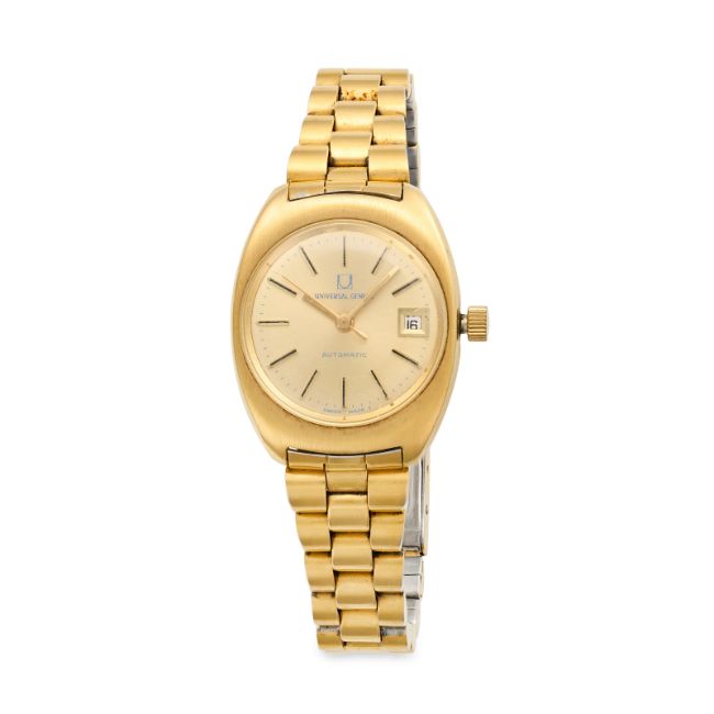NO RESERVE - UNIVERSAL GENÈVE, A LADIES VINTAGE AUTOMATIC WRISTWATCH, the gold-tone case surrounding the brushed champagne dial with baton hour markers, outer minute track and date aperture at 3 o'clock, to a matching gold-tone bracelet with fold-over clasp, case and clasp signed Universal Genève, automatic movement, case back numbered 527602 / 2837475, case 25mm. Not currently running at time of cataloguing.