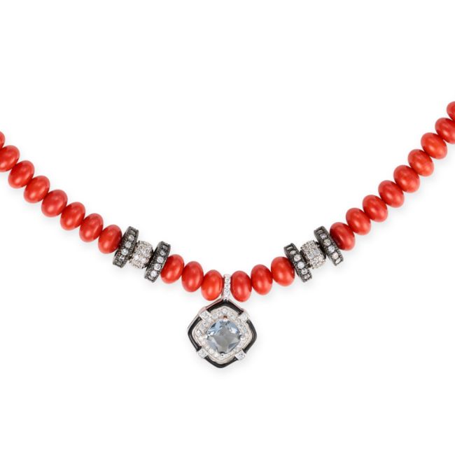 NO RESERVE - A CORAL AND BLUE TOPAZ NECKLACE comprising a row of polished coral beads, accented by rondelles set with round cut cubic zirconia, suspending a pendant set with a cushion cut blue topaz and accented by further cubic zirconia and black enamel, the clasp set with further cubic zirconia, no assay marks, 46.0cm, 37.3g.