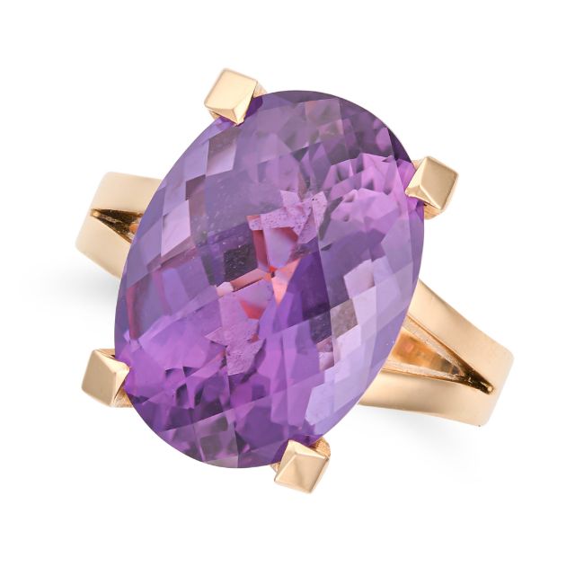 NO RESERVE - AN AMETHYST AND DIAMOND RING in 18ct rose gold, set with an oval facetted amethyst of approximately 11.74 carats, the gallery accented by round brilliant cut diamonds, partial British hallmarks, size P1/2 / 8, 13.0g.