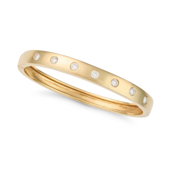 NO RESERVE - A DIAMOND BANGLE the hinged bangle set with round brilliant cut diamonds, the diamonds totalling 1.1-1.2 carats, stamped 14K, inner circumference 17.5cm, 34.7g.