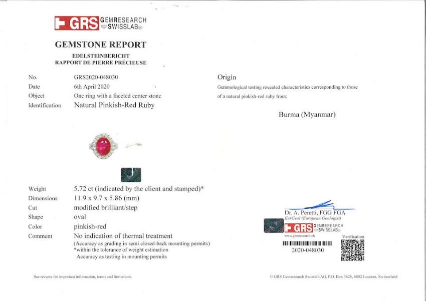 A Ruby and Diamond Ring The oval-cut ruby weighing 5.72 carats, within a brilliant-cut diamond surround, extended to the bifurcated half hoop, diamonds approximately 1.10 carats total, ring size 6½ Footnotes: Accompanied by a GRS report stating that the natural pinkish-red ruby has no indications of thermal treatment and originates from Burma (Myanmar). 5.72克拉天然無經加熱處理緬甸紅寶石配鑽石戒指 鑽石共重約1.10克拉,戒指尺寸6½,附GRS證書 For further information on this lot please visit Bonhams.com For further information about this lot please visit the lot listing