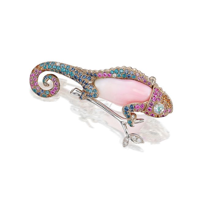 A Conch Pearl, Gem-Set and Diamond Novelty Brooch The chameleon of whimsical design, the body set with a baroque conch pearl, the head, fin, tail and legs highlighted by circular-cut pink, orange and blue sapphires and similarly cut blue topaz, to a rose-cut colourless hardstone eye, accented by brilliant-cut diamonds, conch pearl approximately 17.85 carats, length 5.5cm Footnotes: 海螺珠配彩色寶石及鑽石'變色龍'別針 Potential bidders who intend to export this lot are advised that certain permits may be required for export. If you are interested in this lot, please contact the Jewellery Department before bidding. 此拍品如要出口香港,可能須要申請出口許可證,若有興趣競標者,請在競投前與珠寶部聯絡。 This lot is subject to the following lot symbols: Y Y Subject to CITES regulations when exporting items outside of the UK, see clause 13. For further information on this lot please visit Bonhams.com For further information about this lot please visit the lot listing