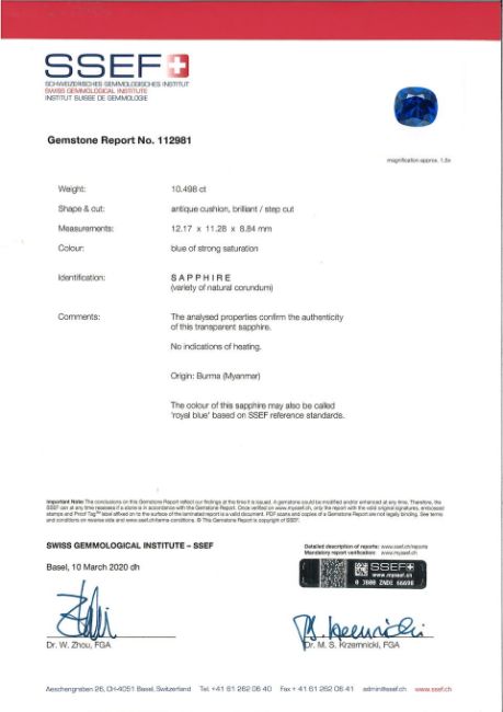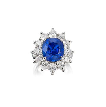 A Sapphire and Diamond Ring The cushion-shaped sapphire, weighing 10.49 carats, within a pear-shaped diamond surround, diamonds approximately 3.85 carats total, ring size 6 Footnotes: Accompanied by a report from SSEF stating that the natural sapphire is 'Royal Blue' colour with strong saturation, has no indications of heat treatment and originates from Burma (Myanmar). Accompanied by a GIA report stating that the natural sapphire is 'Royal Blue', a deep blue colour, has no indications of heat treatment and originates from Burma (Myanmar). 10.49克拉天然無經加熱處理緬甸'皇家藍'藍寶石配鑽石戒指,附SSEF及GIA證書 藍寶石共重約3.85克拉,戒指尺寸6 For further information on this lot please visit Bonhams.com For further information about this lot please visit the lot listing