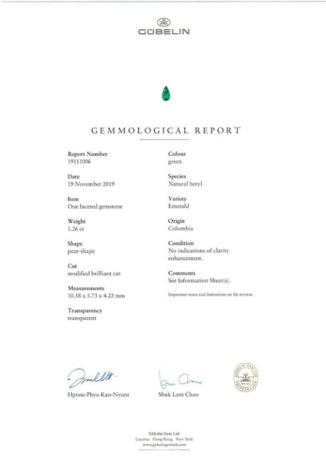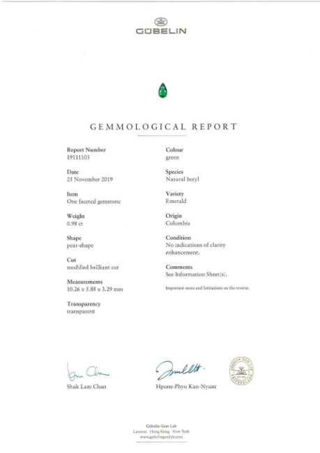 A Pair of Emerald and Diamond Pendent Earrings The pear-shaped emerald surmounts, suspending similarly cut emerald drops, each within a marquise-cut diamond surround, between similarly cut diamond spacers, diamonds approximately 3.35 carats total, emeralds 6.06 carats total, length 4.0cm Footnotes: Accompanied by four Gübelin reports stating that the 1.98, 1.84, 1.26 and 0.98 carat natural emeralds have no indications of clarity enhancement and originate from Colombia. 祖母綠配鑽石耳環一對 祖母綠共重6.06克拉,鑽石共重約3.35克拉,附4張Gübelin證書 For further information on this lot please visit Bonhams.com For further information about this lot please visit the lot listing