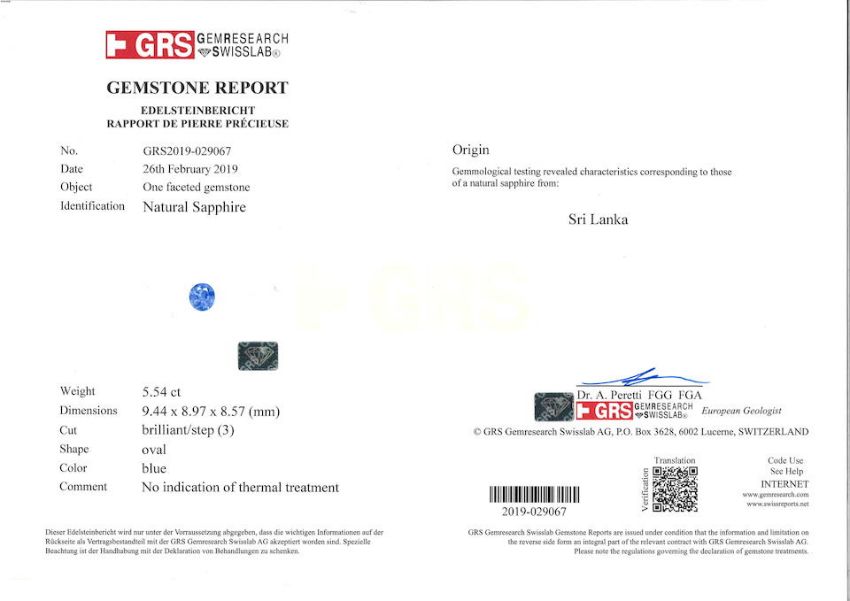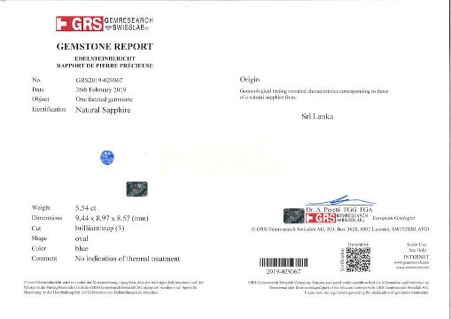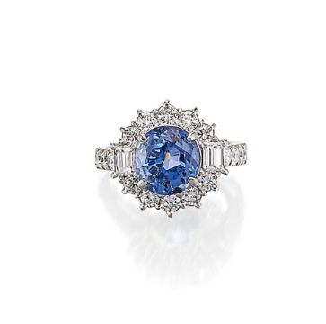 A Sapphire and Diamond Ring The oval-cut sapphire, weighing 5.54 carats, between baguette-cut diamond shoulders, within a brilliant-cut diamond surround, extended to the shoulders, diamonds approximately 1.65 carats total, ring size 6¼ Footnotes: Accompanied by a GRS report stating that the natural sapphire has no indications of thermal treatment and originates from Ceylon (Sri Lanka). 5.54克拉天然無經加熱處理斯里蘭卡藍寶石配鑽石戒指,附GRS證書 鑽石共重約1.65克拉,戒指尺寸6¼ For further information on this lot please visit Bonhams.com For further information about this lot please visit the lot listing