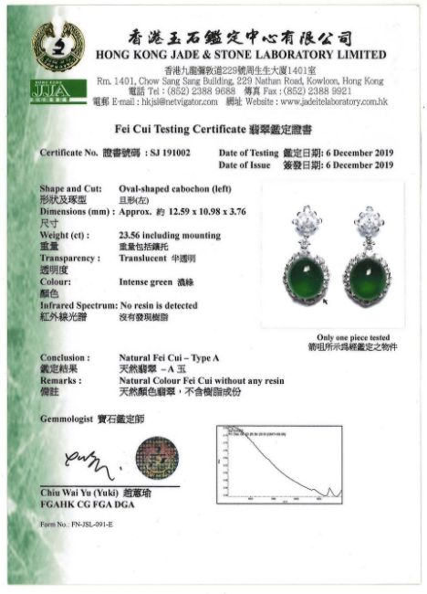A Pair of Jadeite and Diamond Pendent Earrings Each highly translucent jadeite cabochon of intense emerald green colour, accented by pear, princess and brilliant-cut diamonds, diamonds approximately 2.70 carats total, the selected jadeite 12.5 x 19.9 x 3.7mm, length 3.0cm Footnotes: Accompanied by a Hong Kong Jade & Stone Laboratory report stating that the selected natural colour fei cui (jadeite jade) has no resin detected. 天然翡翠配鑽石耳環 鑽石共重約2.70克拉,翡翠約12.5 x 19.9 x 3.7毫米,附香港玉石鑑定中心證書,鑑定為天然硬玉質翡翠-A玉 For further information on this lot please visit Bonhams.com For further information about this lot please visit the lot listing
