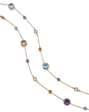 A Gem-Set and Diamond 'Parentesi' Sautoir, by Bulgari The double-sided rose-cut blue topaz, green quartz, citrine and amethysts, inter-spaced by pavé-set brilliant-cut diamonds, signed, numbered, length 91.0cm, original pouch Footnotes: 彩色寶石配鑽石'Parentesi'項鏈,寶格麗 項鏈長度約9.10厘米,附原裝袋 For further information on this lot please visit Bonhams.com For further information about this lot please visit the lot listing