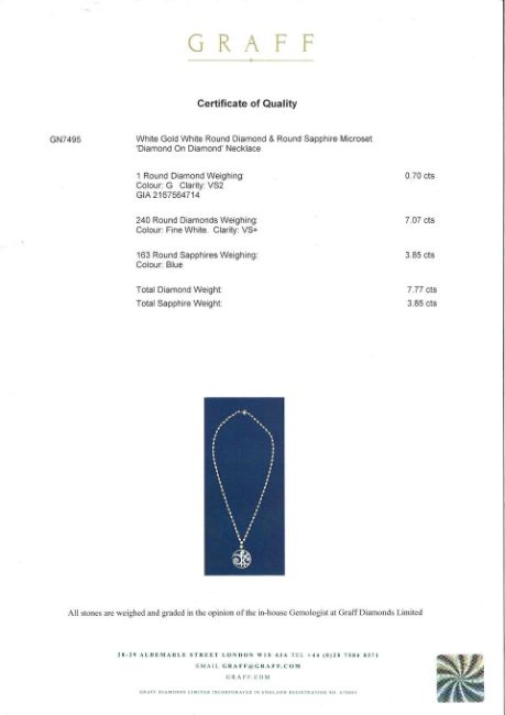 A Sapphire and 'Diamond On Diamond' Necklace, by Graff The pendant of three-dimensional design, microset with circular-cut sapphires, within a brilliant-cut diamond surround and cover-frame, the centre diamond weighing 0.70 carat, completed by a similarly cut diamond necklace, remaining diamonds approximately 7.05 carats total, sapphires approximately 3.85 carats total, signed, numbered, pendant length 3.9cm, necklace length 43.7cm, original case and pouch Footnotes: Accompanied by a GIA report stating that the 0.70 carat diamond is G colour and VS2 clarity. Also accompanied by an original quality certificate from Graff. 鑽石配藍寶石'Diamond On Diamond'項鍊,格拉夫 最大鑽石0.70克拉G色VS2淨度,其他鑽石共重約7.05克拉,藍寶石共重約3.85克拉,附GIA證書,格拉格拉夫證書,原裝袋及盒 For further information on this lot please visit Bonhams.com For further information about this lot please visit the lot listing