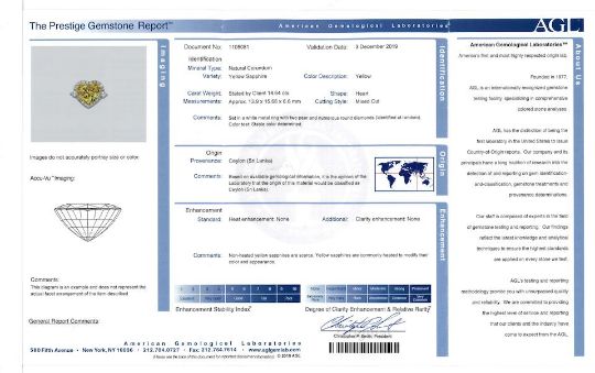 A Coloured Sapphire and Diamond Ring The heart-shaped yellow sapphire, weighing 14.64 carats, between pear-shaped diamond shoulders, within a brilliant-cut diamond surround, extended to the gallery and half hoop, diamonds approximately 1.90 carats total, ring size 6 Footnotes: Accompanied by an AGL report stating that the natural yellow sapphire has no indications of heat or clarity enhancement and originates from Ceylon (Sri Lanka). 14.64克拉天然無經加熱處理斯里蘭卡黃色剛玉配鑽石戒指,附AGL證書 鑽石共重約1.90克拉,戒指尺寸6 For further information on this lot please visit Bonhams.com For further information about this lot please visit the lot listing