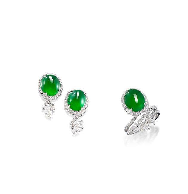 A Jadeite and Diamond Ring and Earring Suite Each earring set with a highly translucent jadeite cabochon of intense emerald green colour, within a brilliant-cut diamond surround, accented by pear-shaped diamonds; the ring en suite, diamonds approximately 2.00 carats total, selected jadeite cabochons 12.6 x 10.3 x 4.6mm and 10.4 x 9.0 x 4.1mm, ring size 5¼ (2) Footnotes: Accompanied by two Hong Kong Jade & Stone Laboratory reports stating that the selected natural colour fei cui (jadeite jade) have no resin detected. 天然翡翠配鑽石戒指及耳環套裝 鑽石共重約2.00克拉,戒指尺寸5¼,戒指所鑲翡翠12.6 x 10.3 x 4.6毫米,耳環最大翡翠10.4 x 9.0 x 4.1毫米,各附香港玉石鑑定中心證書,鑑定為天然硬玉質翡翠-A玉 For further information on this lot please visit Bonhams.com For further information about this lot please visit the lot listing