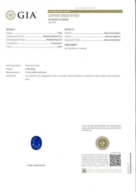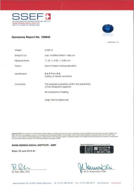 A Sapphire and Diamond Ring The oval-cut sapphire, weighing 6.38 carats, within a brilliant-cut diamond surround, extended to the shoulders, diamonds approximately 1.15 carats total, ring size 6 Footnotes: Accompanied by a report from SSEF stating that the natural sapphire has no indications of heat treatment and originates from Burma (Myanmar). Accompanied by a GIA report stating that the natural sapphire has no indications of heat treatment and originates from Burma (Myanmar). 6.38克拉天然無經加熱處理緬甸藍寶石配鑽石戒指,附SSEF及GIA證書 鑽石共重約1.15克拉,戒指尺寸6 For further information on this lot please visit Bonhams.com For further information about this lot please visit the lot listing