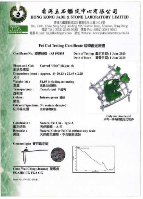 A Jadeite and Diamond Novelty Brooch/Pendant Modelled as a fishnet, the translucent carved jadeite fish of emerald green colour, the openwork surmount accented with jadeite cabochons of similar material, highlighted by brilliant and rose-cut diamonds, the selected jadeite 20.4 x 22.5 x 2.3mm, length 3.8cm Footnotes: Accompanied by a Hong Kong Jade & Stone Laboratory report stating that the selected natural colour fei cui (jadeite jade) has no resin detected. 天然翡翠配鑽石'漁網'別針/吊墜 翡翠約20.4 x 22.5 x 2.3毫米,附香港玉石鑑定中心證書,鑑定為天然硬玉質翡翠-A玉,可轉換為吊墜 For further information on this lot please visit Bonhams.com For further information about this lot please visit the lot listing