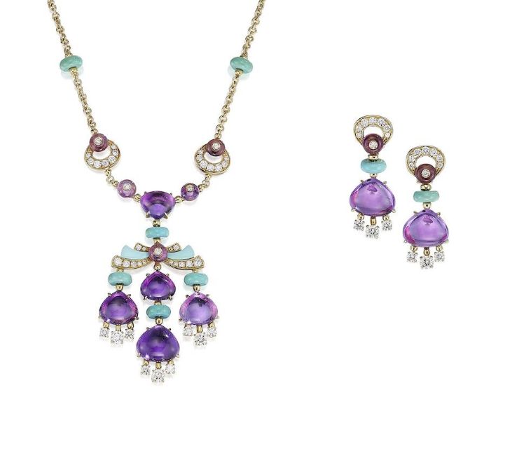 A Gem-Set and Diamond 'Mediterranean Eden' Pendant Necklace and Earring Suite, by Bulgari The pendant set with cabochon amethysts, highlighted by turquoise discs and plaques, accented by brilliant-cut diamonds, to a similarly set trace-link chain; the pair of pendent earrings en suite, signed, numbered, lengths: pendant 6.0cm, necklace 42.8cm, earrings 3.7cm, original cases (2) Footnotes: 紫水晶,綠松石配鑽石'Mediterranean Eden'項鏈及耳環套裝,寶格麗 附原裝袋 For further information on this lot please visit Bonhams.com For further information about this lot please visit the lot listing