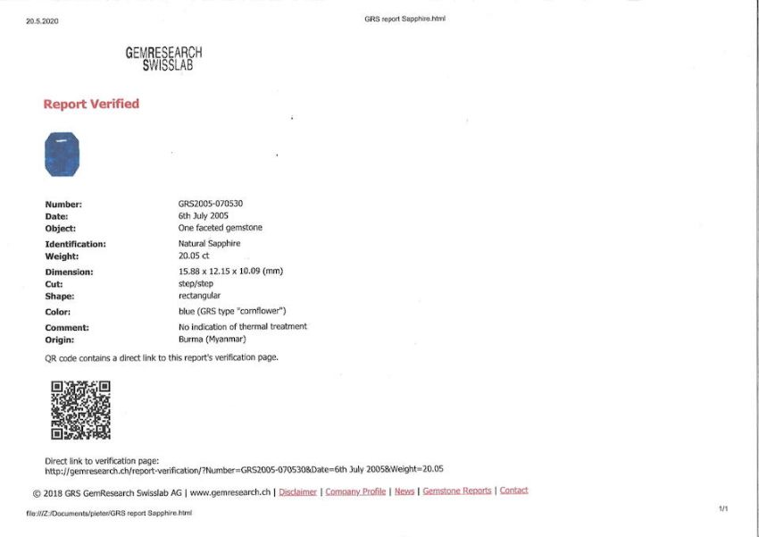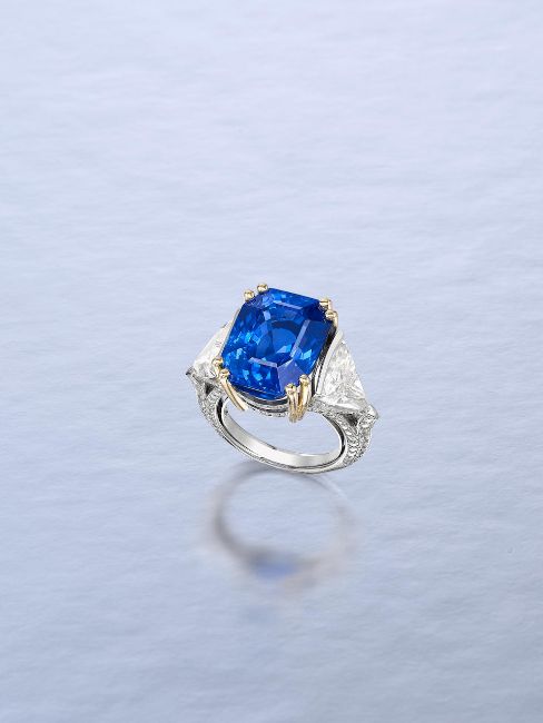 An Impressive Sapphire and Diamond Dress Ring, by La Serlas The step-cut sapphire, weighing 20.05 carats, between triangular-cut diamond shoulders, the mount accented by brilliant-cut diamonds, extended to the half hoop, diamonds approximately 4.00 carats total, signed, numbered, maker's mark, ring size 7½, original case Footnotes: Accompanied by a report from SSEF stating that the natural sapphire has no indications of heat treatment and originates from Ceylon (Sri Lanka). Accompanied by a copy of GRS report stating that the natural sapphire is (GRS type 'cornflower') blue colour, has no indications of thermal treatment and originates from Burma (Myanmar). 20.05克拉天然無經加熱處理斯里蘭藍寶石配鑽石戒指,La Serlas 鑽石共重約4.00克拉,戒指尺寸7½,附SSEF,GRS證書及原裝盒 Property from a European Collector 歐洲珍藏 For further information on this lot please visit Bonhams.com For further information about this lot please visit the lot listing