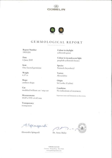 An Alexandrite and Diamond Ring The cushion-shaped alexandrite, weighing 6.37 carats, between baguette-cut diamond shoulders, within a brilliant-cut diamond surround, extended to the half hoop, diamonds approximately 2.50 carats total, ring size 6½ Footnotes: Accompanied by a Gübelin report stating that the natural chrysoberyl alexandrite changes from Yellowish-Green (daylight) to Purplish-Yellowish-Brown (incandescent light) colour, has no indications of treatment and originates from Ceylon (Sri Lanka). Accompanied by an AGL report stating that the natural chrysoberyl alexandrite changes from Brownish Green (daylight) to Pinkish Brown (incandescent light) colour, has no indications of clarity enhancement and originates from Ceylon (Sri Lanka). 6.37克拉天然無經加熱處理斯里蘭卡亞歷山大變色石配鑽石戒指 鑽石共重約2.50克拉,戒指尺寸6½,附Gübelin及AGL證書 For further information on this lot please visit Bonhams.com For further information about this lot please visit the lot listing