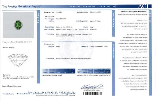 A Peridot and Diamond Ring The oval-cut peridot, weighing 20.50 carats, between baguette-cut diamond shoulders, within a brilliant-cut diamond openwork frame, diamonds approximately 2.10 carats total, ring size 6¾ Footnotes: Accompanied by an AGL report stating that the natural peridot has no evidence of clarity enhancement. 20.50克拉天然無經加熱處理橄欖石配鑽石戒指,附AGL證書 鑽石共重約2.10克拉,戒指尺寸6¾ For further information on this lot please visit Bonhams.com For further information about this lot please visit the lot listing