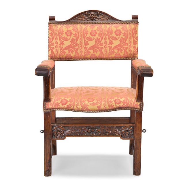An Italian walnut armchair 17th century and later With a grotesque mask carved toprail and an upholstered back, on square section legs joined by a mask and foliate carved stretcher, some or all of the carving probably of a later date, 69.5cm wide x 53cm deep x 100.5cm high, (27in wide x 20 1/2in deep x 39 1/2in high) Footnotes: Provenance Until now the offered lot formed part of a collection of furniture and works of art, ranging from the 15th century to the 18th century, which furnished an early 15th century Sussex manor house. This collection was amassed predominantly over the course of the last quarter of the previous century; it includes a number of rare and, in a few instances, very early pieces. This lot is subject to the following lot symbols: W For further information on this lot please visit Bonhams.com For further information about this lot please visit the lot listing