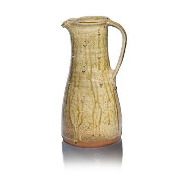 Jim Malone Tall jug Stoneware, mottled green ash and running olive glazes with carved decoration. 35 cm high, 17 cm high Base impressed with artist's and Ainstable seals. Lot to be sold without reserve. This lot is subject to the following lot symbols: AR AR Goods subject to Artists Resale Right Additional Premium. For further information on this lot please visit Bonhams.com For further information about this lot please visit the lot listing