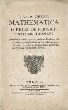 FERMAT (PETRUS DE) Varia Opera Mathematica, the deceptive reprint by Friedlaender, half cloth somewhat worn, folio, [Toulouse, 1679] Berlin, 1861; and others (12) Lot to be sold without reserve. This lot is subject to the following lot symbols: • • Zero rated for VAT, no VAT will be added to the Hammer Price or the Buyer's Premium. For further information on this lot please visit Bonhams.com For further information about this lot please visit the lot listing