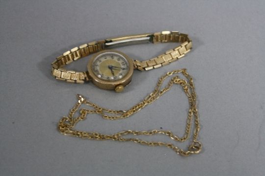A 9CT GOLD WRISTWATCH AND A 9CT GOLD CHAIN, an early 20th Century ladies round case measuring approximately 23.0mm in diameter, Arabic numerals to a two tone dial, blued steeled hands, mechanical hand wound 15 Swiss jewelled movement, unisgned, watch case hallmarked 9ct gold, Glasgow import 1924, with a later added gold plated bracelet, together with a fine 9ct gold filed Figaro chain, measuring approximately 460mm in length, import hallmarked 9ct gold, Birmingham 1991, approximate weight 2.5 grams
