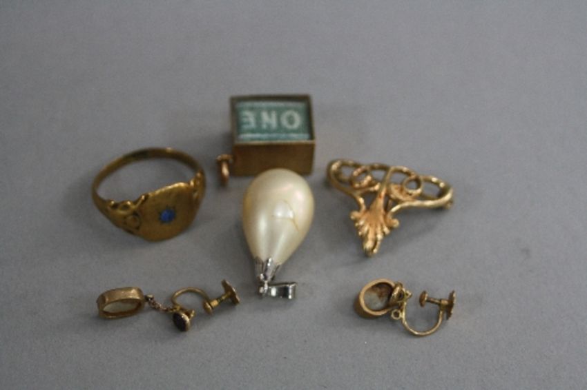 A PAIR OF 9CT EARRINGS, set with mother of pearl and a 9ct charm, etc