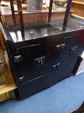A BLACK LACQUERED ORIENTAL SIDE CABINET, with twin double doors, approximate size width 109cm x depth 41cm x height 106cm (sd, repairs etc, for restoration)