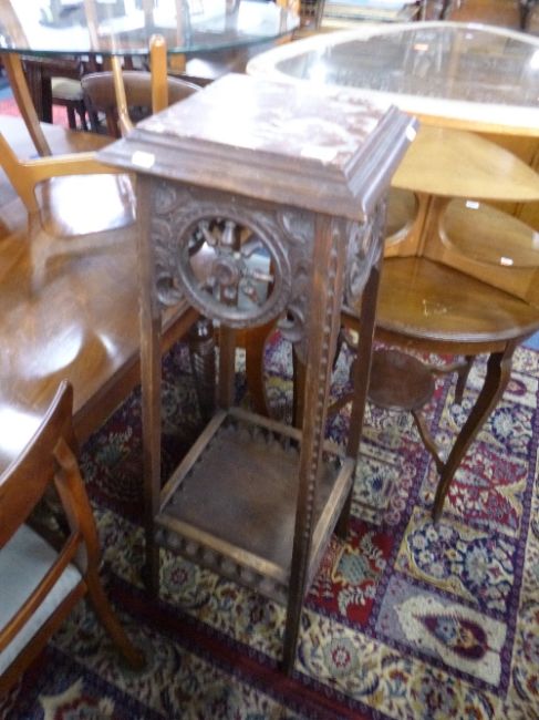 A CARVED OAK FRENCH STYLE JARDINIERE STAND, with inset marble top (sd, losses)