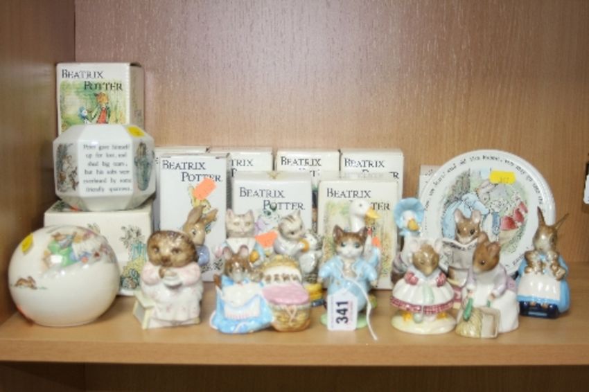 TWELVE BEATRIX POTTER FIGURES, (all Beswick expect one which is Royal Albert), to include 'Tom Kitten', 'Old Woman Who Lived in a Shoe Knitting', 'Mr Drake Puddle-Duck', 'Jemima Puddle-Duck', 'Hunca Munca Sweeping', (all BP3b), 'Tabitha Twitchett', 'Tabitha Twitchett and Miss Moppet' etc (BP3c), Royal Albert 'Tailor of Gloucester', together with boxed Wedgwood 'Peter Rabbit; money box and a teapot stand and a Bunnykins money box (15) (with 10 boxes for figures)