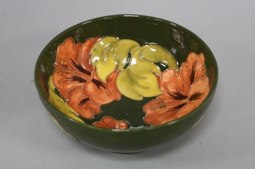 A MOORCROFT POTTERY FOOTED BOWL, Hibiscus pattern on green, impressed and painted marks to base, diameter approximately 16cm