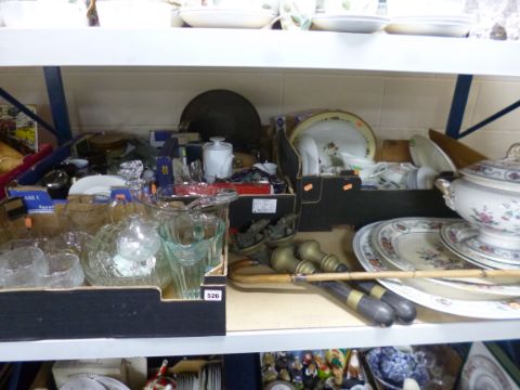 FOUR BOXES OF GLASSWARES, CERAMICS, KITCHENALIA, etc, Victorian part dinner service, beer pumps etc