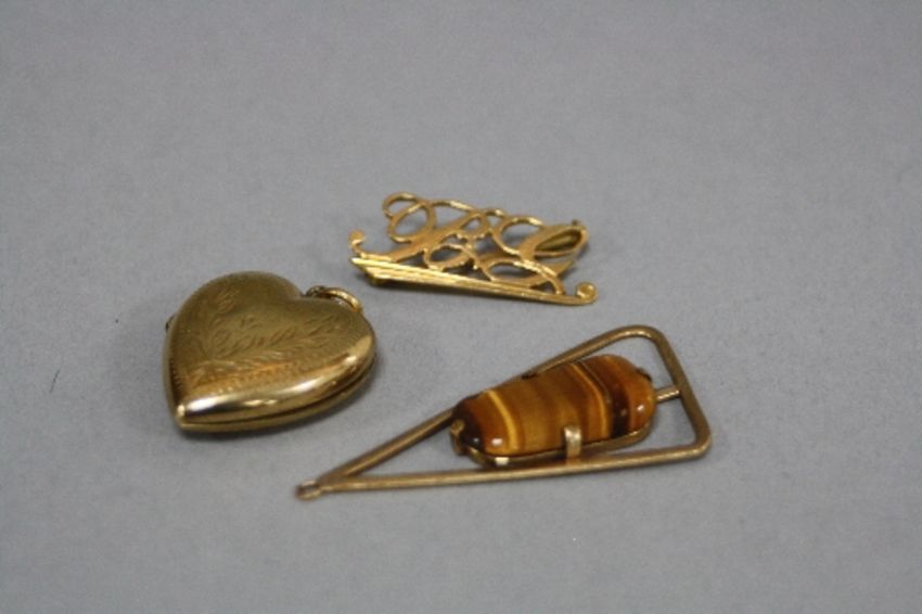 A COLLECTION OF PENDANTS, to include a 9ct gold back and front heart shape locket, a modern abstract design tigers eye pendant, measuring approximately 45mm x 22mm, stamped 9ct, approximate gross weight 3.7 grams, together with a hand made initial brooch, initials BG cut out in a fancy entwinned design, trombone style pull out catch, brooch measuring approximately 28mm in length, stamped K18, approximate gross weight 2.2 grams (3)