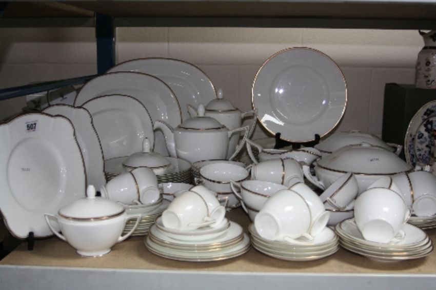A COMPREHENSIVE BONE CHINA WHITE AND GILT RIMMED DINNER SERVICE, unmarked, (over 70 pieces) (s.d.)