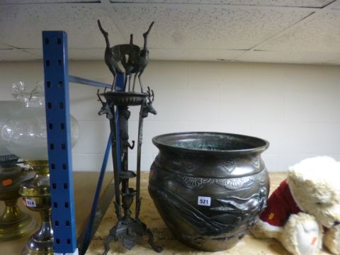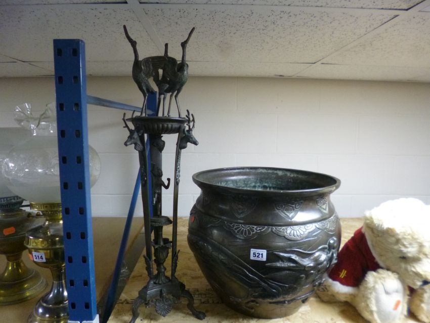 A BRONZED FINISH CHINESE JARDINIERE, cast in relief with dragon and bird, height approximately 32cm, together with a metal stand decorated with birds, deer and cherub, height 65cm (2)