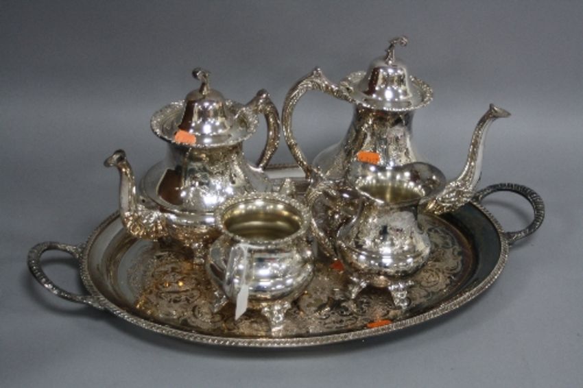 A MODERN SILVER PLATED FOUR PIECE TEA SET, on an oval twin handled tray (5)
