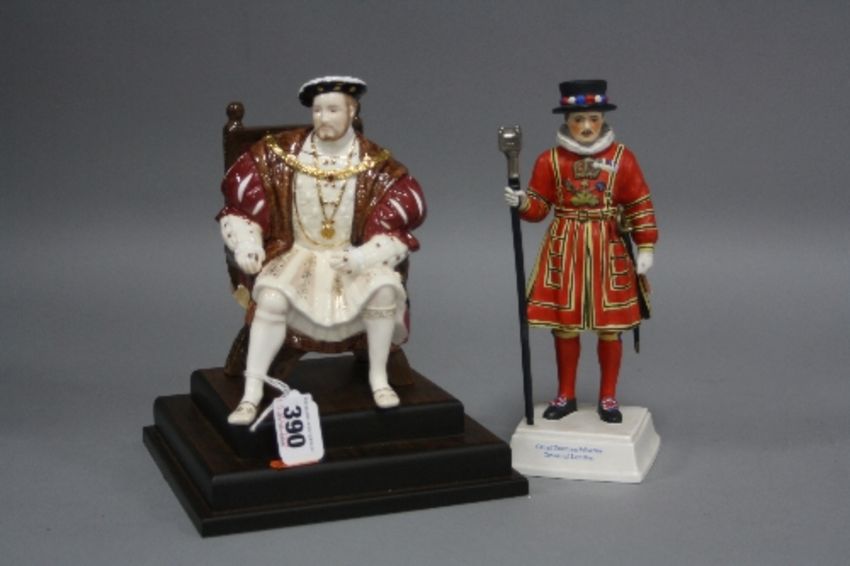 A WEDGWOOD LIMITED EDITION FIGURE, 'Henry VIII', 2294/4500, on wooden plinth, together with Goebel 'Chief Yeoman Warder Tower of London' figure (staff re-glued) (2)