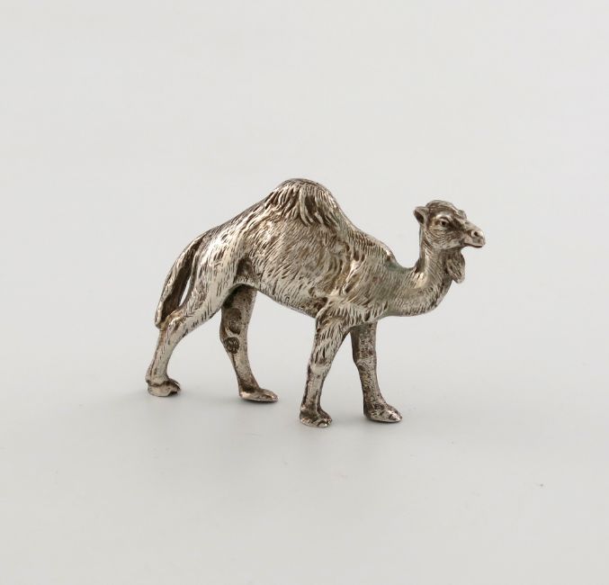 A silver miniature model of a camel, with import marks for Chester 1911, importer`s mark of George Roberts, modelled in a standing position, height 4.2cm, approx. weight 1.2oz.
