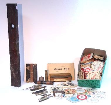 A large mahogany & brass-mounted spirit level, 28" long; together with four cut-throat razors; six pocket knives; numerous beer mats, etc.